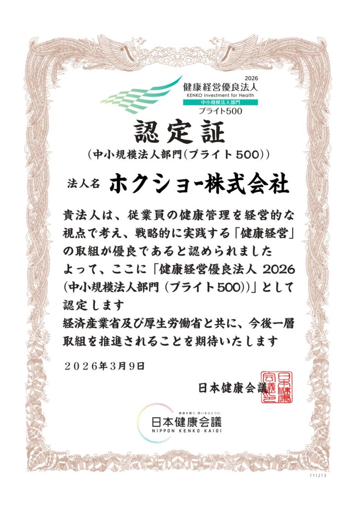 ホクショー㈱は4月1日、経済産業省が推進する健康経営優良法人認定制度において「健康経営優良法人2026(中小規模法人部門)ブライト500」に認定されたと発表した。