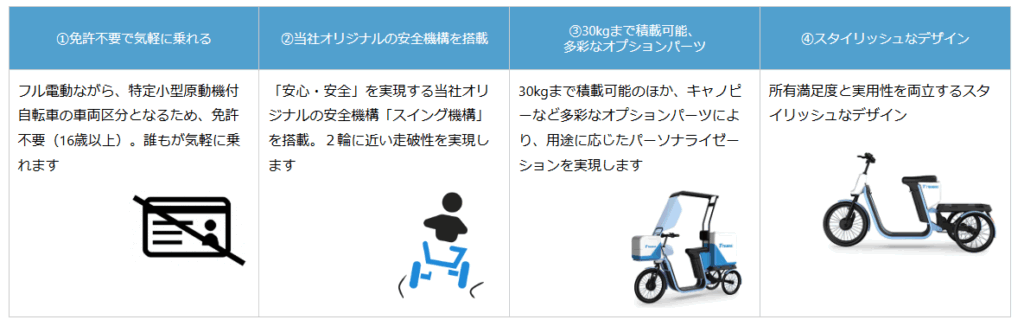 ㈱椿本チエインは6月4日、新事業の1つとして商品開発を強化している小型モビリティ商品として、「免許不要で誰もが気軽に乗れる」をコンセプトに、特定小型原動機付自転車「Full電動Cargo(仮称)」を開発した。
