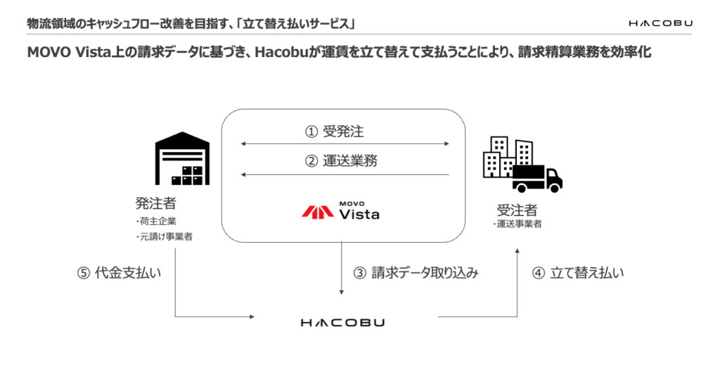同サービスは、Hacobuが運送事業者への運賃を立て替えて支払うことで、支払いサイト(取引金額の締め日から、支払日までの期間)の短縮や振り込み手続きに伴う業務負荷を軽減し、結果として運送事業者の資金繰り改善とサプライチェーン全体のキャッシュフロー早期化を支援する。