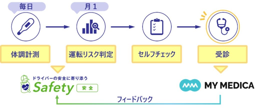 MY MEDICAが提供する、オンラインで診療予約・診療・服薬指導・薬の配送・会計までをシームレスに受けられるサービス「MY MEDICA」と、ロジスティードが提供する安全運行管理ソリューション「SSCV-Safety」を連携し、運転する上でリスクが高いと判定されたドライバーに早期治療を促す。今後は、システム連携により体調確認の精度向上や、サービスの質の向上を図る。