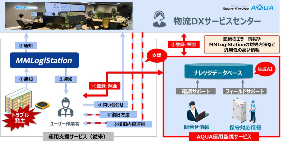 「MMLogiStation」の年間利用料には運用保守サービスが含まれており、これまで同社の物流DXサービスセンターによる「運用支援サービス」(運用サポート・分析レポート)を提供していたが、今回、「AQUA運用監視サービス」を追加することで、インシデント起票の自動化に加え、ナレッジ化・ナレッジ検索に生成AIを活用することで、問題の早期解決につながると期待している。