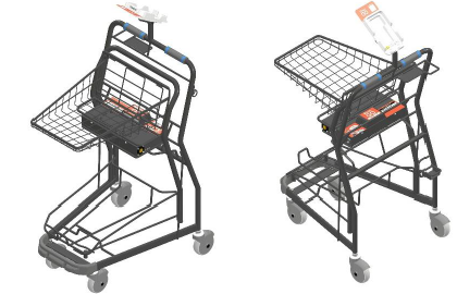 「Shop&Go はかりカート」は、上段・下段のかごの重さを量る計量器が、かごへ投入した商品の重量と、スマホアプリ上でバーコードスキャンされた商品の重量との差異を検知する。このようにスマートフォンのアプリと連動する計量器搭載カートは、日本で初めての製品。