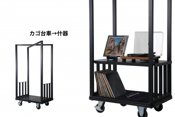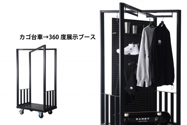 最大の特徴は、上部に設けられたクロス構造。このクロス部分にはハンガーオプションを取り付けることで衣類やアイテムを吊り下げられ、さらに有孔ボードオプションを組み合わせると、展示スペースとして活用できる。荷台部分にはソファやテーブルを置くことで、簡易的な休憩スペースにもなり、ホテルや商業施設での使い方が大きく広がる。「KAKU CROSS」は「運ぶ」だけでなく「見せる」「使う」へと進化したカートと位置付けている。