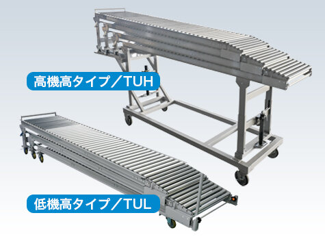低床式倉庫に対応した高機高タイプ「TUH」と、高床式倉庫対応の低機高タイプ「TUL」の2タイプをラインナップ。電気やエアを使わないため、取り扱いが容易な上に、キャスタ付きのため、移動や引き出し操作は手動で簡単に行える。負担の大きなトラックからの荷降ろし作業の省力化を支援する。