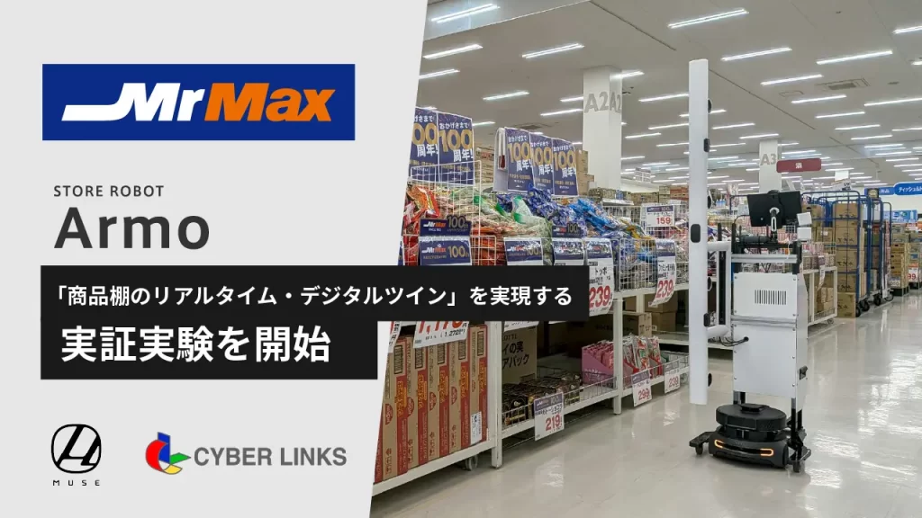 ㈱MUSEは2月17日、棚割ソフトウェア国内大手の㈱サイバーリンクスと共同で、㈱ミスターマックスが運営する総合ディスカウントストア「ミスターマックス吉塚店」においてロボットによる「商品棚のリアルタイム・デジタルツイン」の実証実験を開始すると発表した。