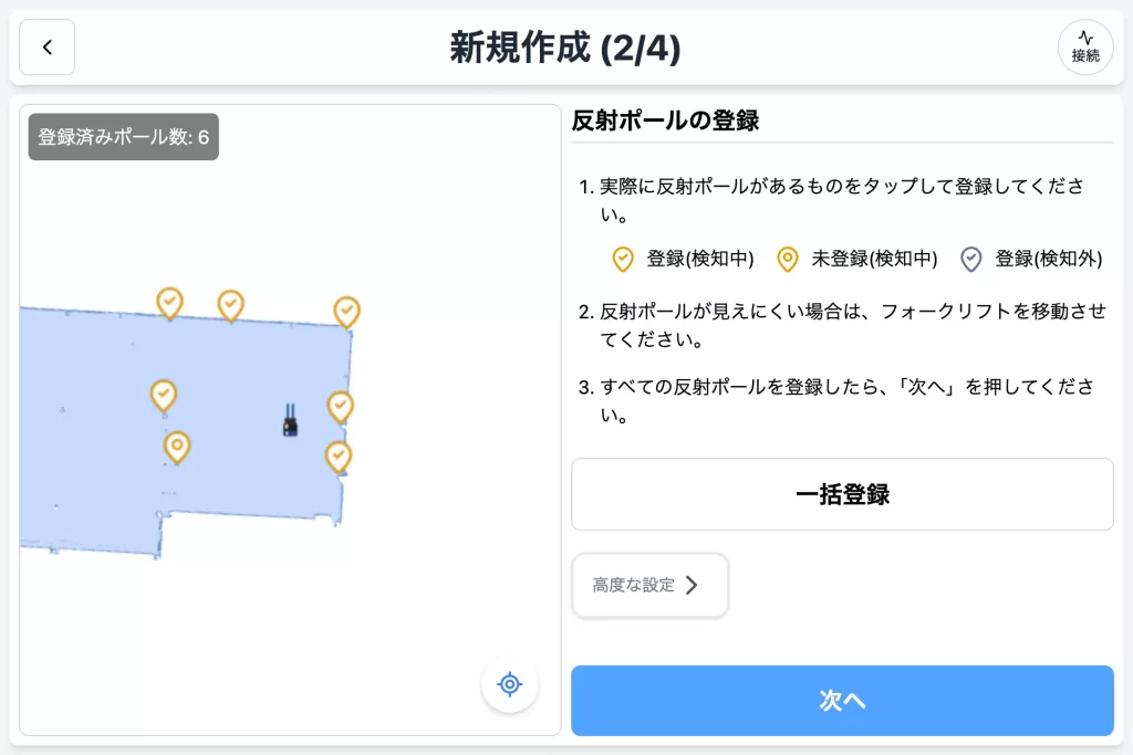 AutoForkは、そうした課題に対応する仕組みとして反射ポールマップ編集機能を搭載し、現場担当者が反射ポール(反射板)を高さ2.1mに設置し、ポールマップエディターを起動することで、走行エリア登録から編集・再設定までを自ら完結できる環境を実現している。