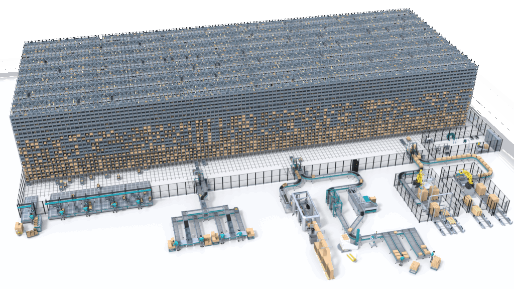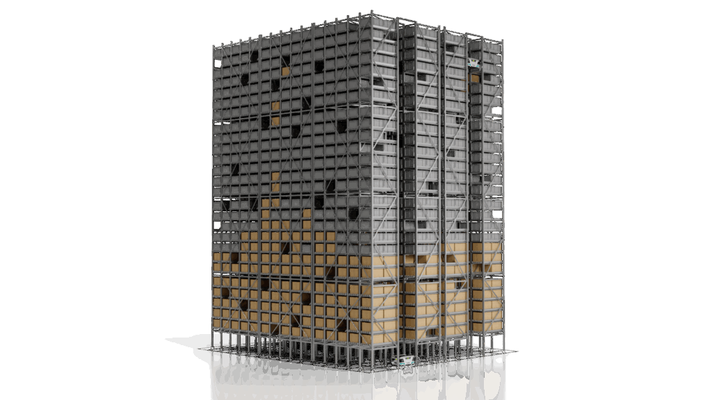 在庫品のほか、出荷用の空のコンテナ(段ボール箱、オリコン等)を保管する。また、注文処理済のコンテナをシステム内で一時バッファし、適したタイミングで順立て出庫が可能。