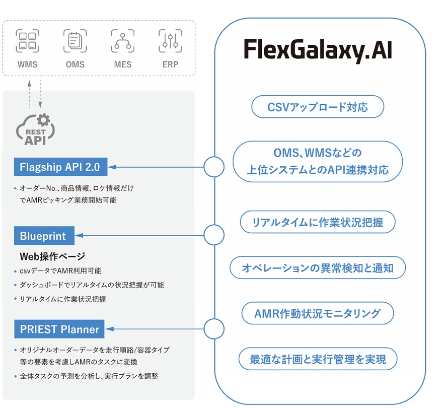 AMRを3台導入すれば、最低でも作業員1名の削減が可能だ。さらに、現場管理の一部もフレアイが担う。ピッキング・格納・棚卸といった各種タスクは、フレアイ(FlexGalaxy.ai)が状況に応じて自動的にAMRへ分配し、現場全体の作業を最適化する。