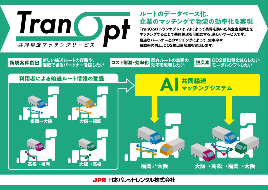 多数の企業の輸送経路などをデータベース化し、膨大な物流データからAIによって業界を跨いだ荷主企業同士をマッチングすることで、共同輸送を可能にする。共同輸送によって実車率や積載率の向上、CO2排出量の削減をはかり、飛躍的な物流の効率化に貢献する。